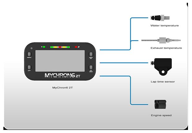 Es können mehrere Displayseiten frei konfiguriert und über die 4 Taster ausgewählt werden. Die Display-Beleuchtung kann in 7 verschiedenen Farben eingestellt werden und die Helligkeit steuert ein Lichtsensor. Uuml;ber das integrierte 25Hz GPS-Modul wird die Geschwindigkeit erfasst, auf dem Display angezeigt und kann später mit weiteren GPS-Kanälen, z.B. gefahrene Linie, Beschleunigungen… am PC ausgewertet werden. Die Lithium Batterie versorgt das MyChron6 2T zwanzig Stunden lang mit Strom. Es kann auch von einer externen 12V Batterie versorgt werden.