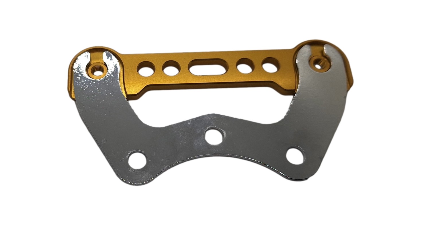 Die Halterplatte passt perfekt für die Aufnahme vom OTK Kettenschutzhalter (Siehe Bild 2). Zusätzlich wird der Kettenschutz stabilisiert und das lösen der Schrauben und Muttern durch Vibrationen fällt weg.