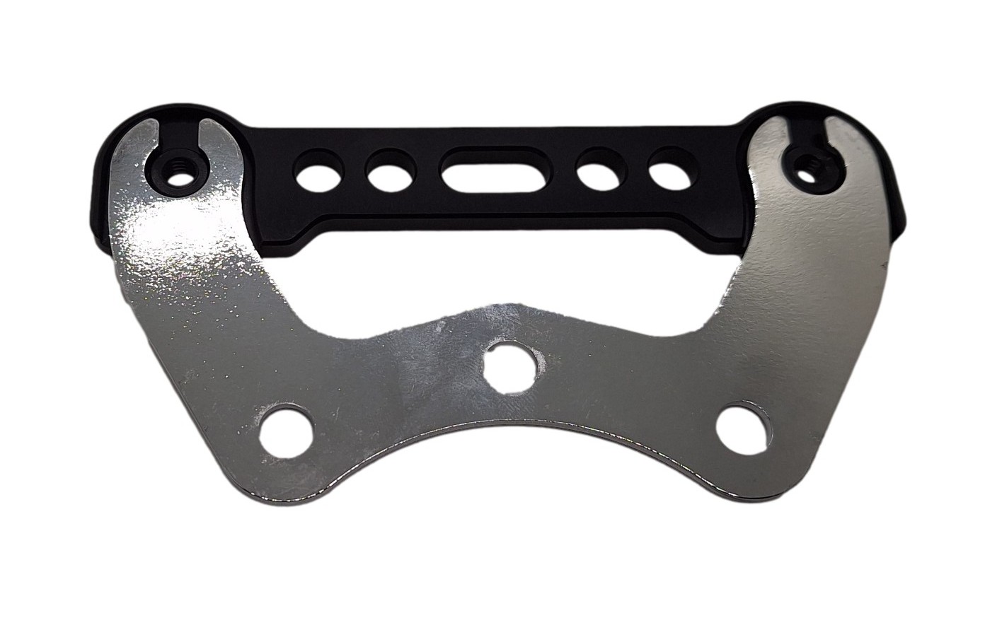 Die Halterplatte passt perfekt für die Aufnahme vom OTK Kettenschutzhalter (Siehe Bild 2). Zusätzlich wird der Kettenschutz stabilisiert und das lösen der Schrauben und Muttern durch Vibrationen fällt weg.